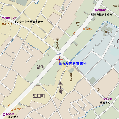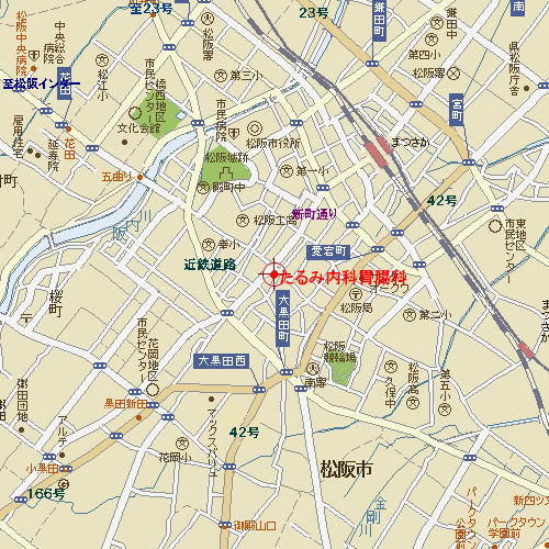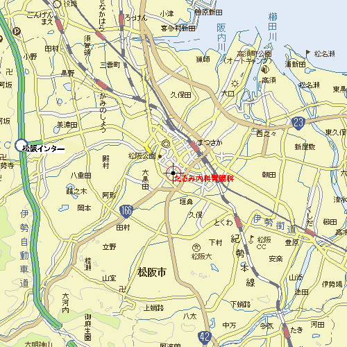 松阪市街のほぼ中央、駅前通りの新町5丁目、駅から真っ直ぐ徒歩で約15分、