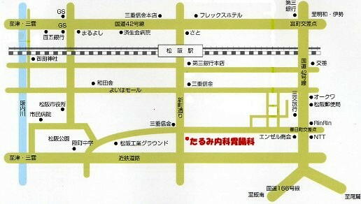 4つ目の信号、新町交叉点をわたってすぐ左側です。車では伊勢自動車道の松阪インターから